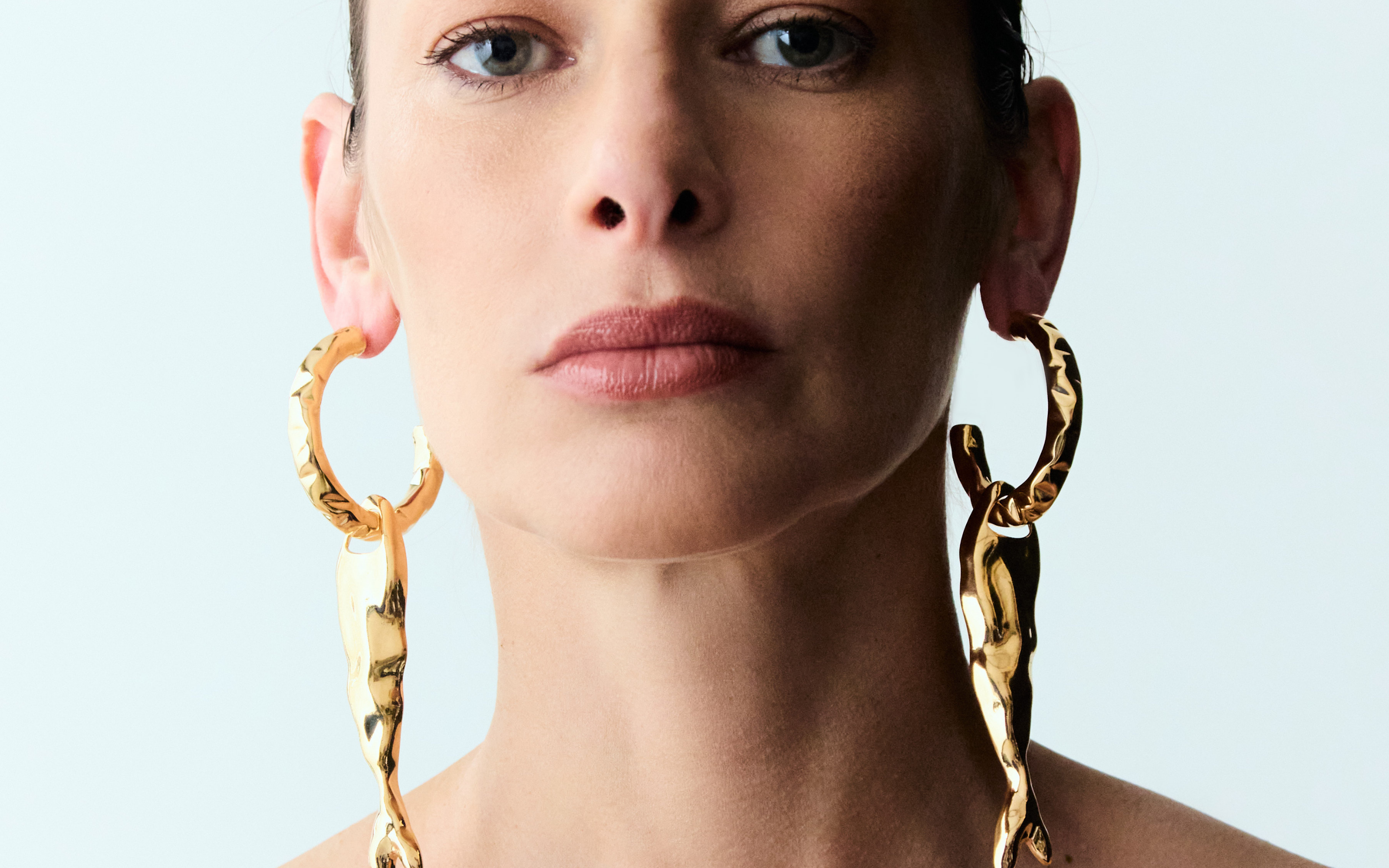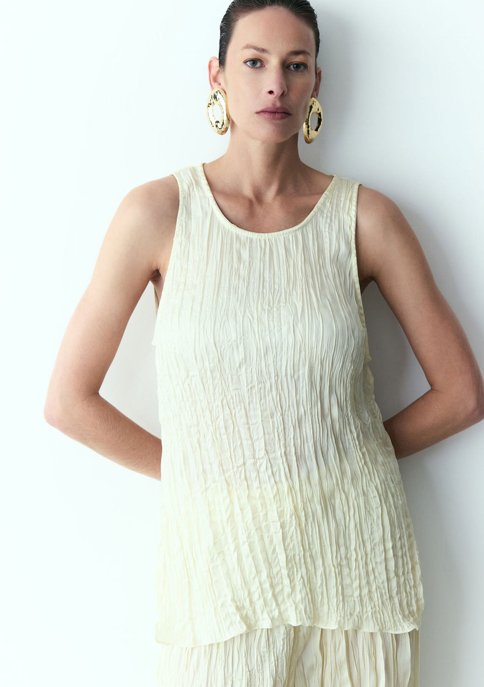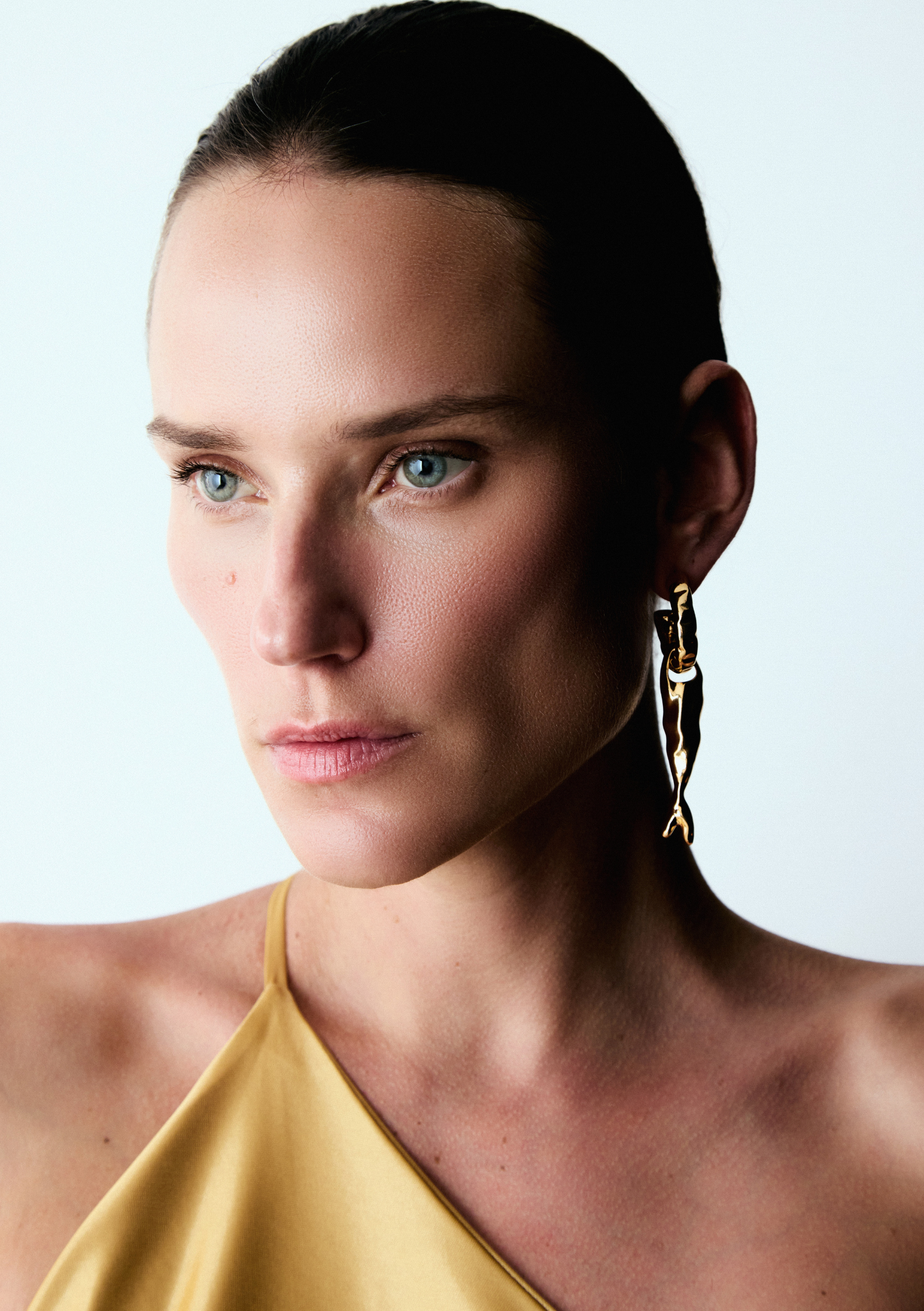 Confeccionado em malha no tom dourado envelhecido, com leve efeito acetinado, o modelo oferece duas possibilidades de uso: com visual assimétrico equilibrado pelo decote drapeado ou em versão ombro único, com costas volumosas e irreverentes. Sua versatilidade se revela nas alças delicadas, que permitem diferentes amarrações, ajustando a altura do decote e possibilitando múltiplas formas de uso.