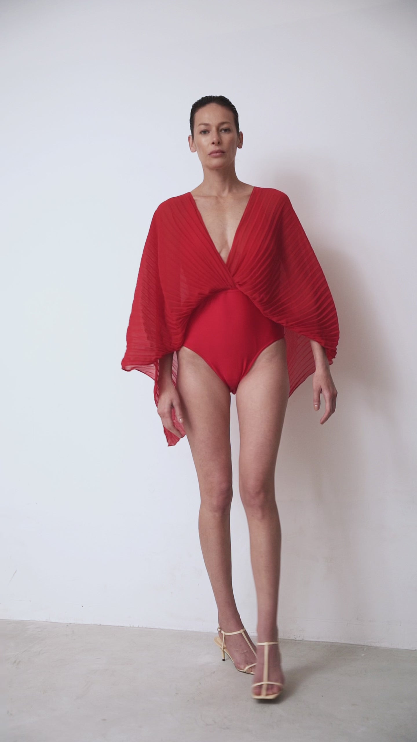 O body pleats Frevo é elaborado em malha de poliamida, combinado com um tecido leve e plissado em formato sanfona, que confere uma textura sofisticada e um caimento fluido. A parte interna oferece suporte ao busto, com um decote em V e alças ajustáveis. As mangas, compostas por dois recortes amplos de tecido, oferecem versatilidade na forma de vestir: podem ser usadas com o volume fluido e mantidas por um discreto abotoamento nas costas ou, alternativamente, as faixas podem ser amarradas no pescoço, criando um novo estilo.