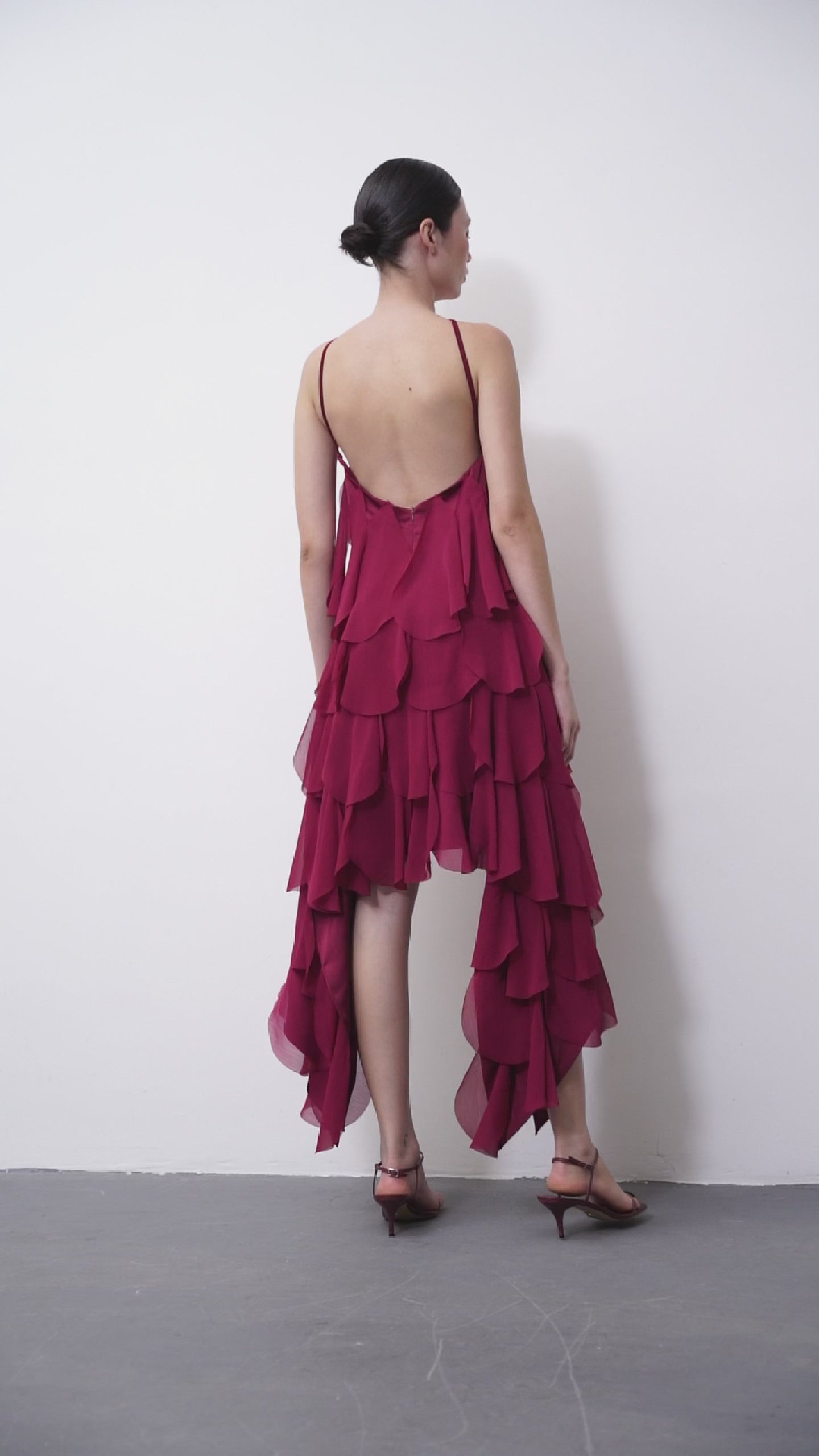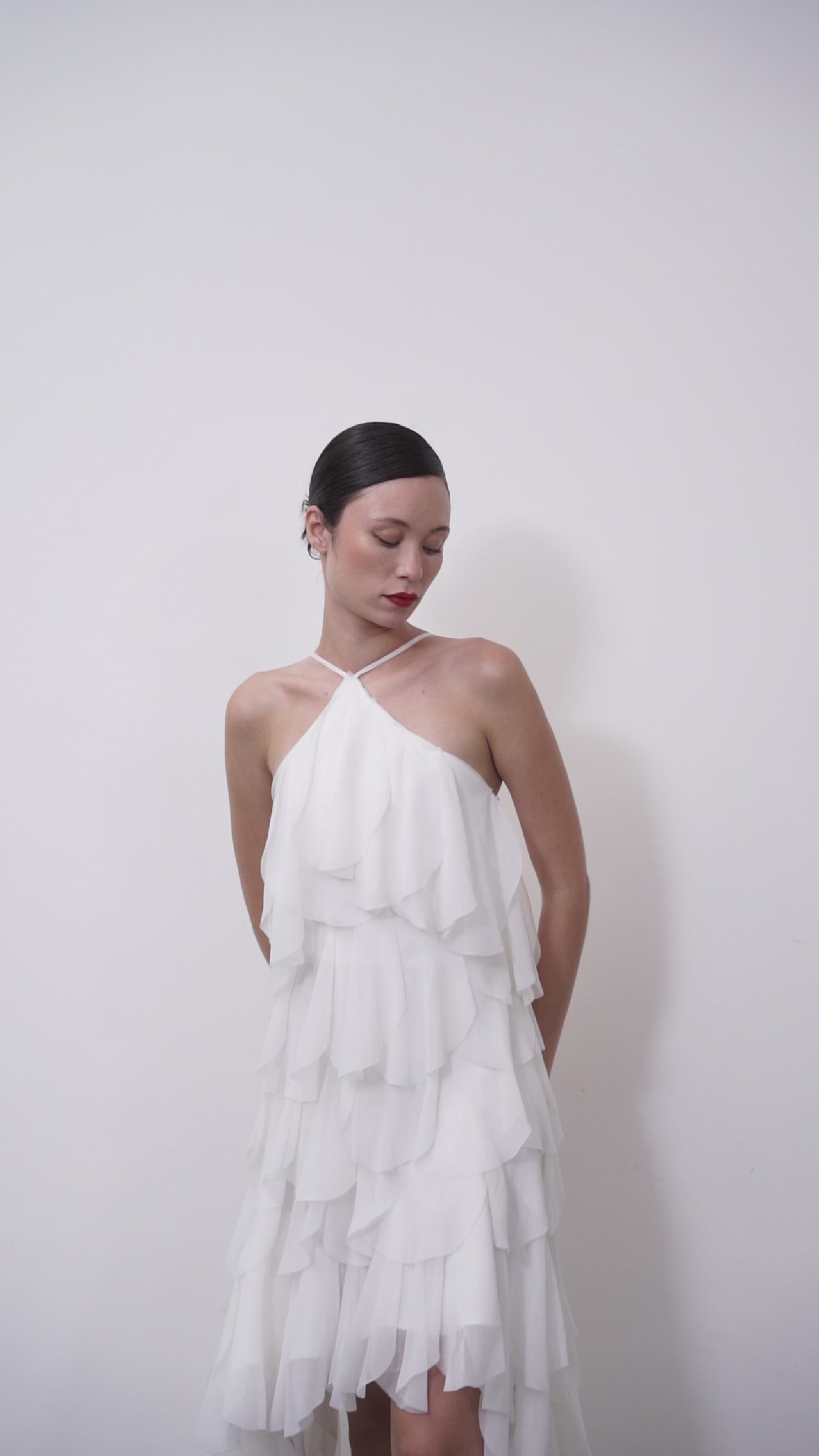 The "Mullet" dress was born from the collaboration between MARINA BITU and NK. The piece has a halterneck at the front and a straight back, with adjustable straps using metal adjusters. The piece has sides that are longer than the front and has laser-cut petal appliqués in delicate, transparent fabric.