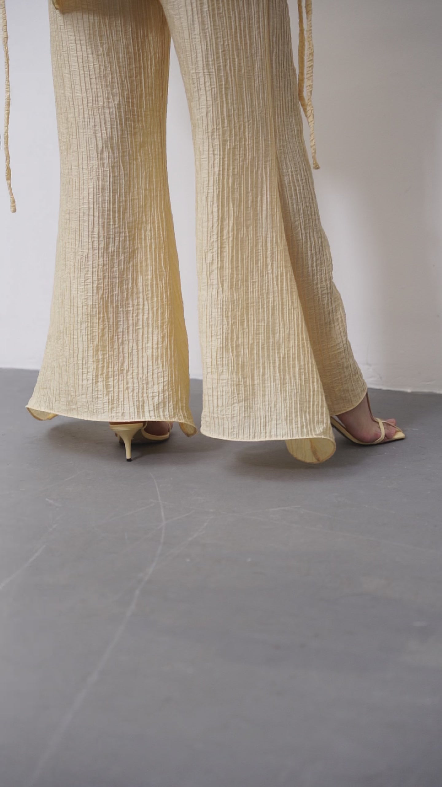 A calça "Pleats Ondas" é confeccionada em um tecido misto de lyocel e poliamida, de origem sustentável, proporcionando leveza e frescor no uso. Sua superfície texturizada imita o efeito de um plissado delicado, enquanto sua baixa tendência a amassar torna a peça uma escolha prática tanto para viagens quanto para o dia a dia. Com ajustes na cintura alta, por meio de cós regulável, e modelagem "flaire", a calça oferece um caimento confortável e ventilado para os dias de verão. O toque final é dado pelo efeito ondulado na barra, obtido com a aplicação de fio de nylon embutido, conferindo um acabamento diferenciado e original.
