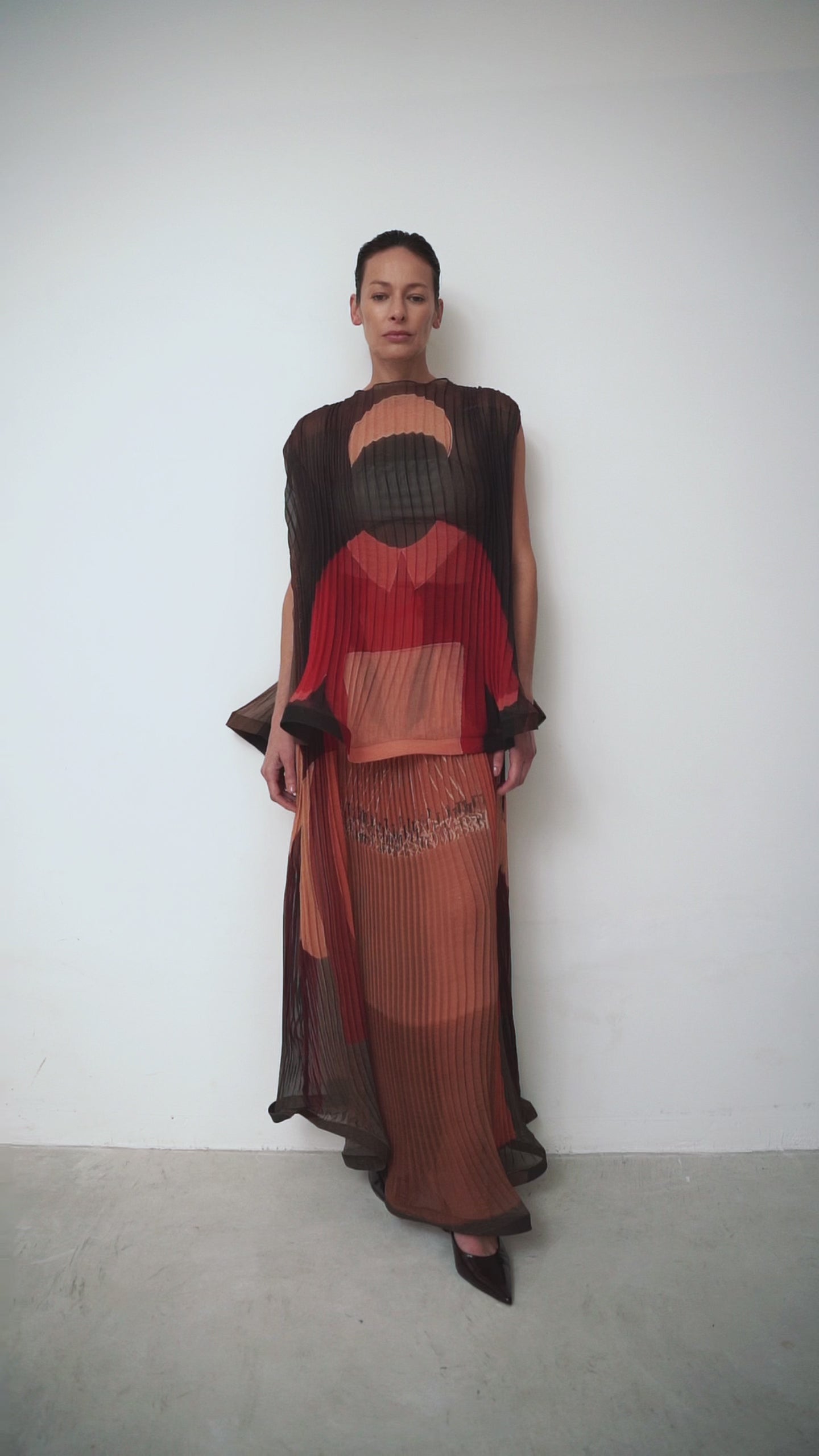 A Saia Pleats Tecelã é inspirada na obra homônima da artista Djanira da Motta e Silva. Confeccionada em georgette plissado, tecido leve, fluido e levemente transparente, o modelo apresenta silhueta ampla, com acabamento especial nas barras, que conferem um movimento ondulado. Com cintura ajustável por meio de vieses do próprio tecido que permitem amarração, a peça apresenta conforto e ajuste ao corpo. Acompanha forro saia de comprimento curto, em malha de poliamida em tom nude.