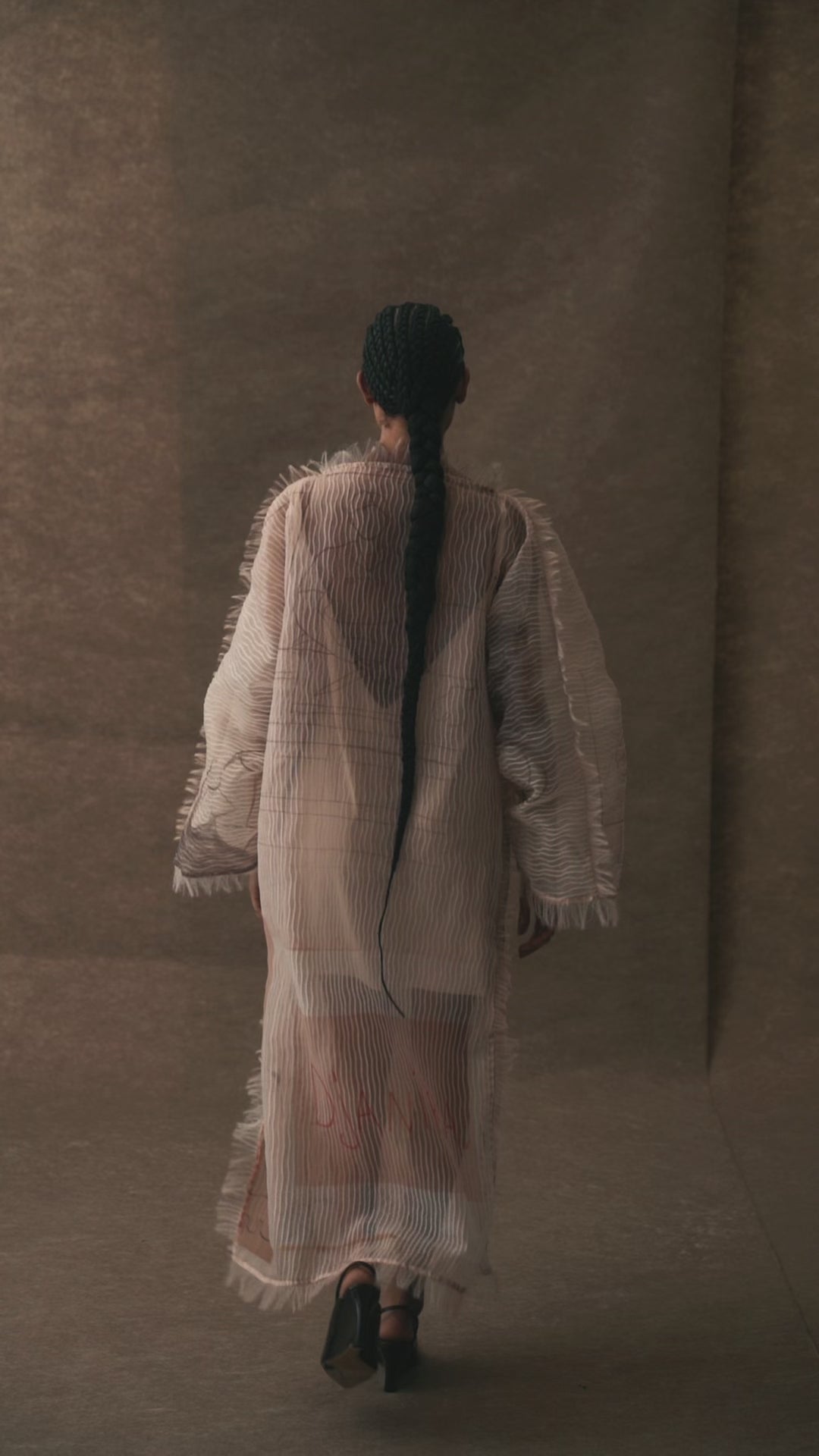 Com modelagem estilo kaftan, o vestido apresenta mangas bufantes com franzido ajustável, decote reto e acabamento desfiado nos ombros e decote, detalhes que reforçam seu caráter artesanal. Acompanha forro tipo slip dress em tecido plano leve, garantindo conforto e fluidez.